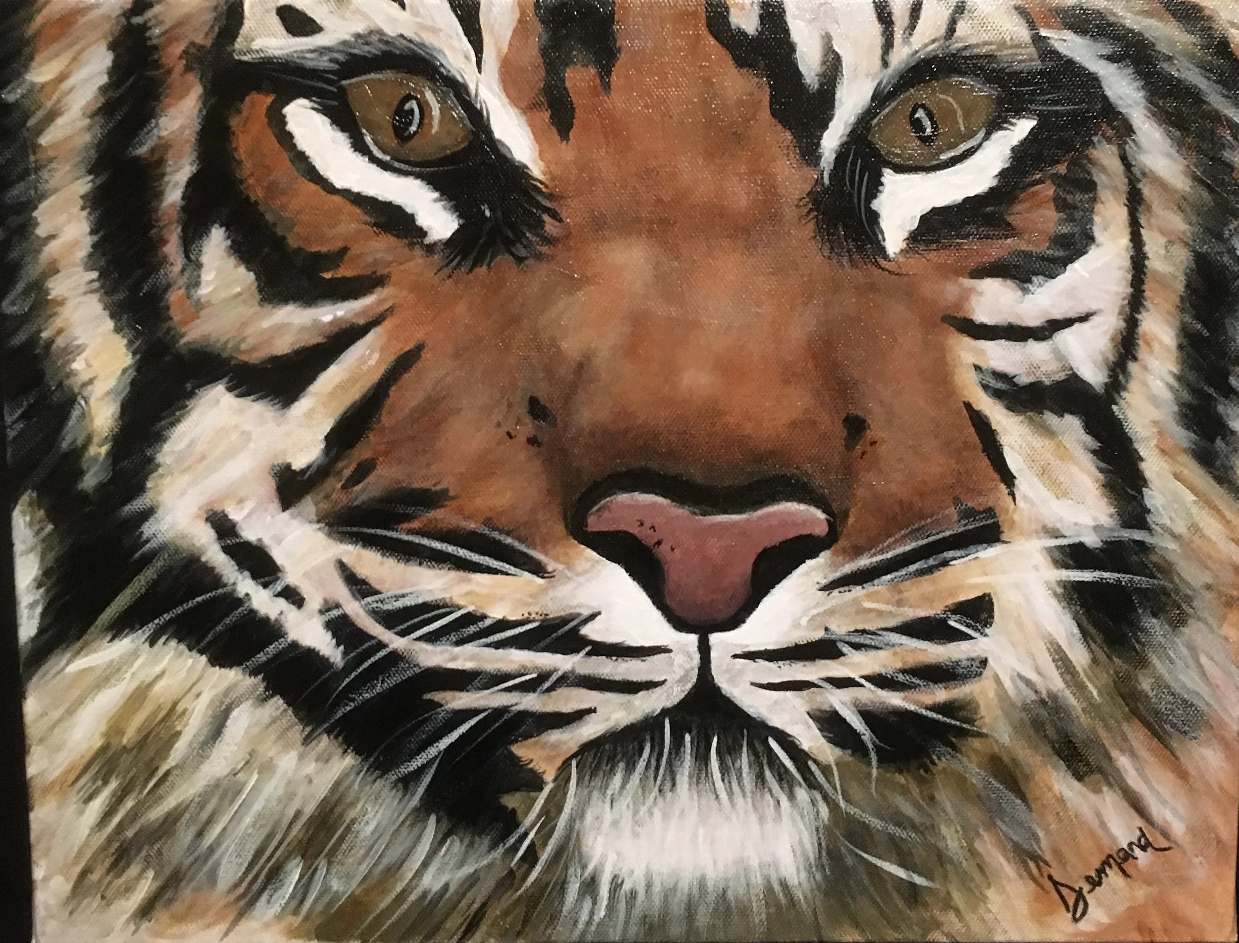 I don’t have a picture of my first painting (that might be a good thing), but I would like to share my second one that I did in 2014. The artist provided detailed steps and shared a file with the sketch of the tiger which made it a doable project for me, especially since drawing is not on my list of strengths. This project was special to me because it gave me some confidence to continue painting, and because my son was graduating from LSU and I wanted the painting to be a special graduation gift.