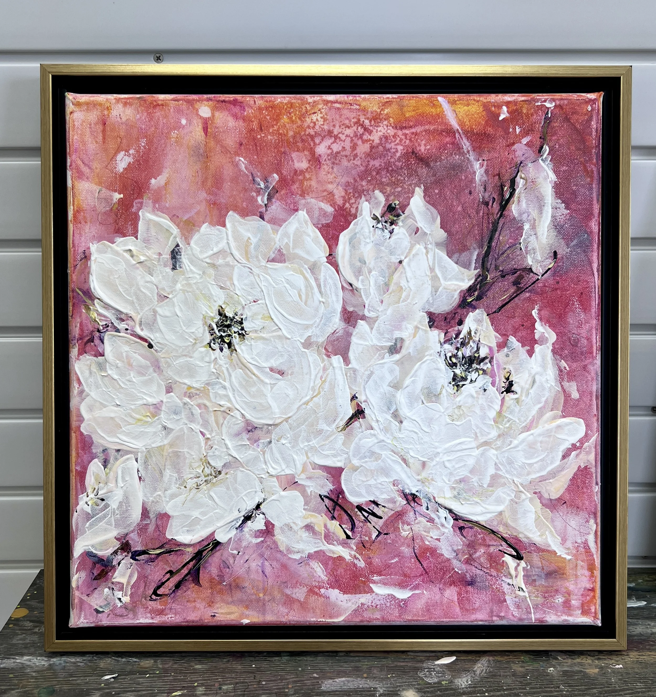 “Be Unique” is an original 16x16 framed acrylic painting featuring a vibrant, fresh display of magnolia blossoms. Layered white petals sit against a bold pink and coral background, creating a lively contrast that instantly draws the eye. The piece is framed for a finished, ready-to-hang presentation.