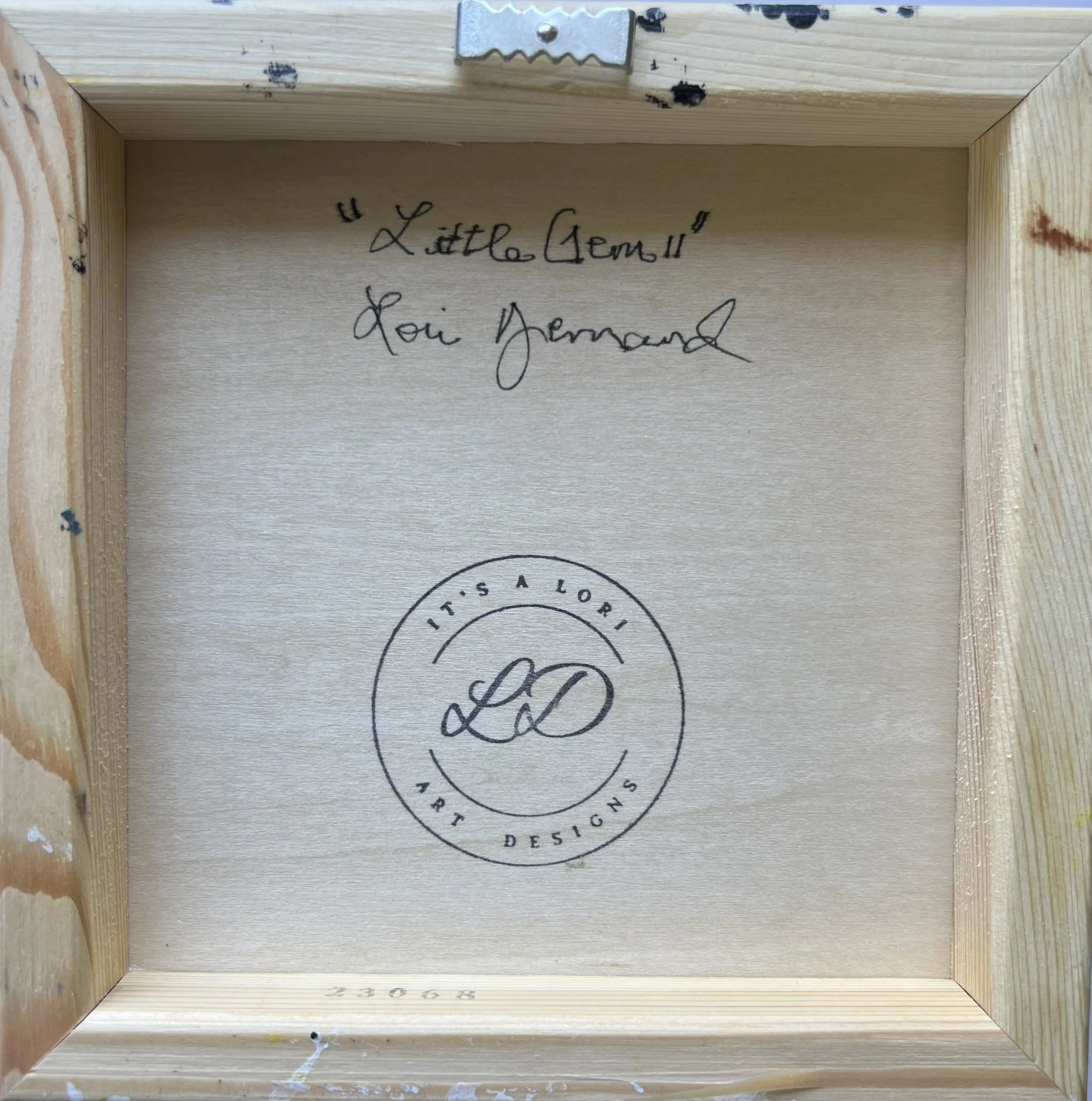 “Little Gem 11” is a 6×6 original acrylic painting on a cradled wood panel — a small but luminous floral study filled with soft texture and joyful detail. Delicate white blossoms float across a background of layered greens, charcoal blues, and hints of golden yellow, creating a dreamy little moment of beauty and calm.