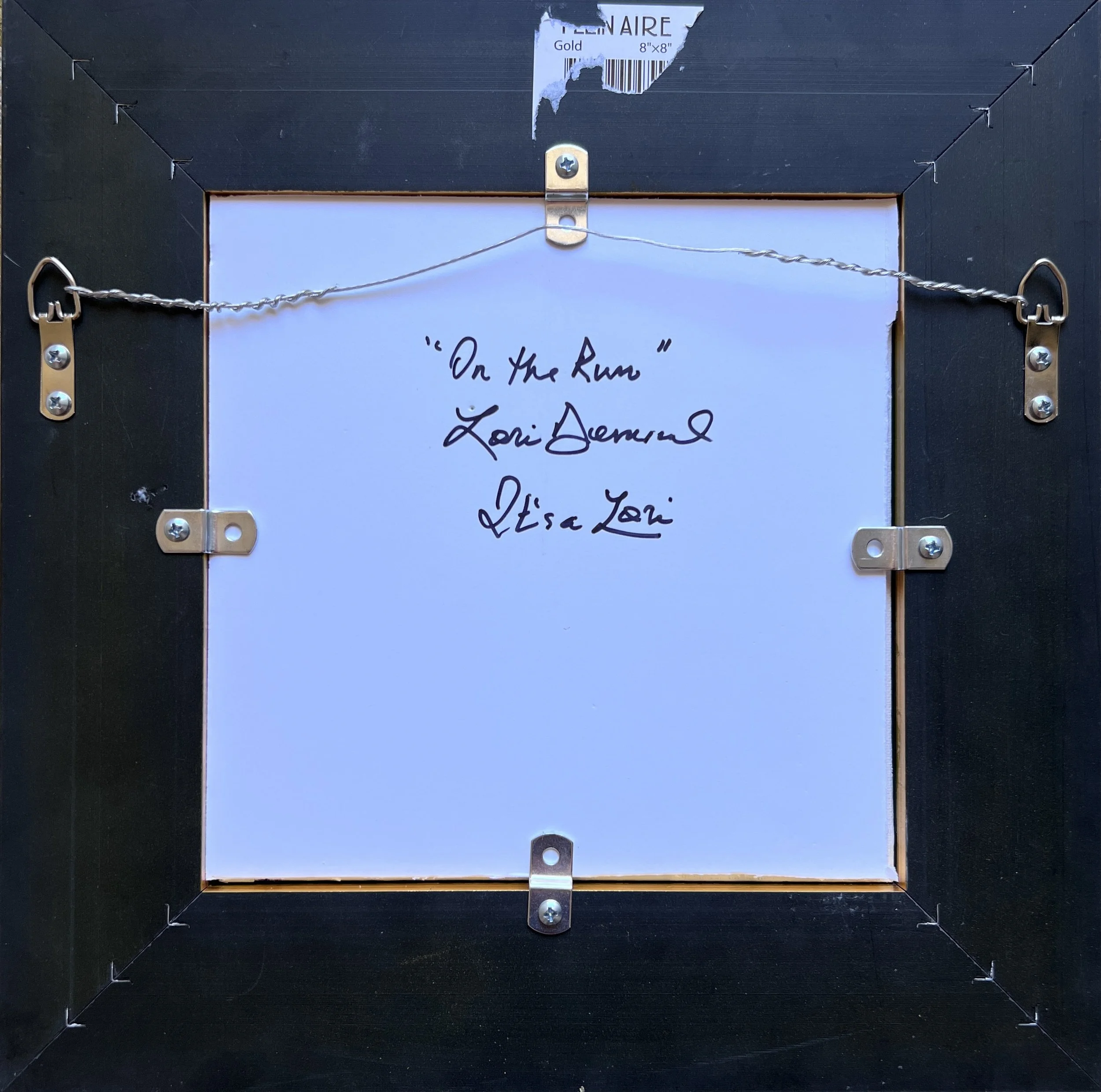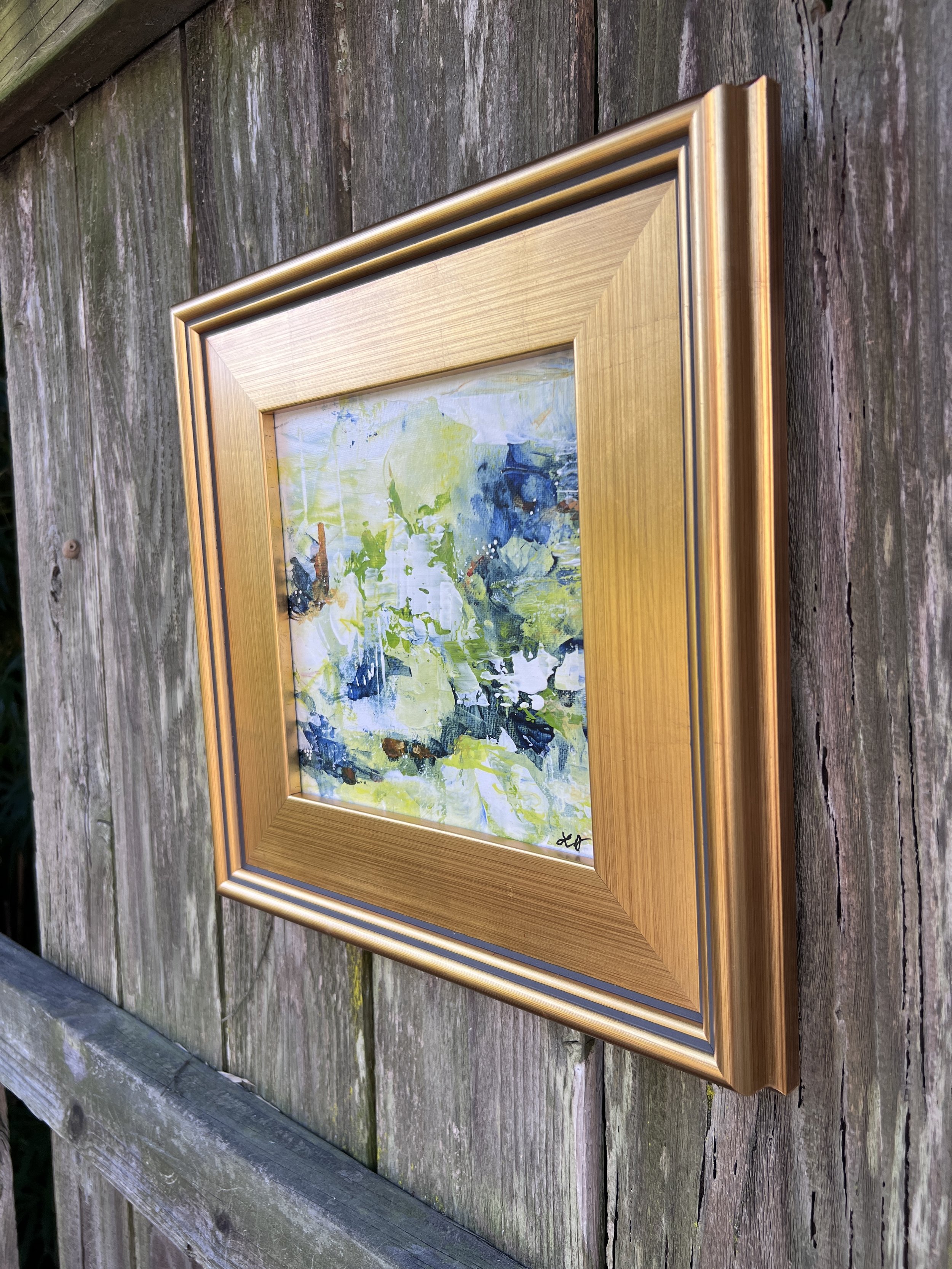 “On The Run” is a framed 8×8 original acrylic abstract painted on a canvas panel and presented in a rich, warm gold frame measuring 14×14. Soft greens, cool blues, and bright pops of white and sienna move quickly across the composition, creating a lively sense of motion and spontaneity.