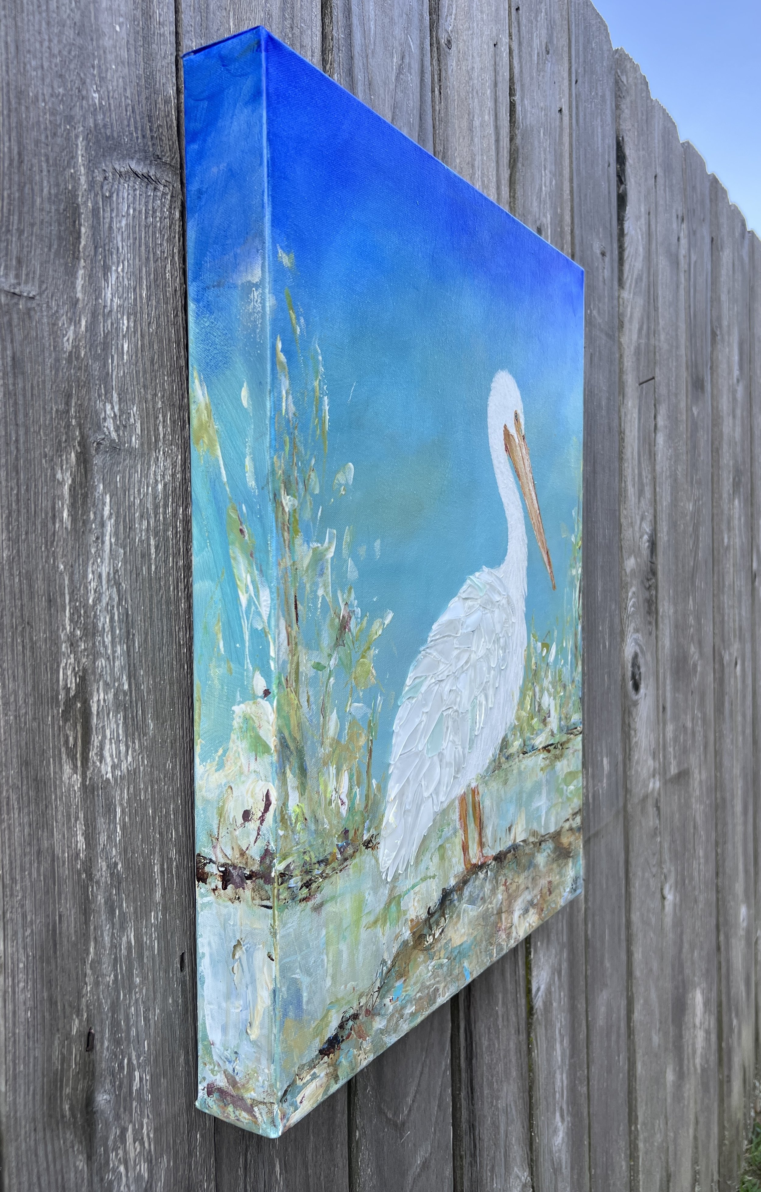 The American White Pelican is known to “vacation” at the LSU Bird Sanctuary located on University Lake. Recent restoration work revealed a dirty little secret, loads of trash also calling the lake home. I have collected many large bags of bottles and other items to be up-cycled into a special series called Don’t Trash Me in an effort to draw attention to the issue. A bird sanctuary with litter in it just isn’t right! “The Magic of Me” is the 4th painting in this series.