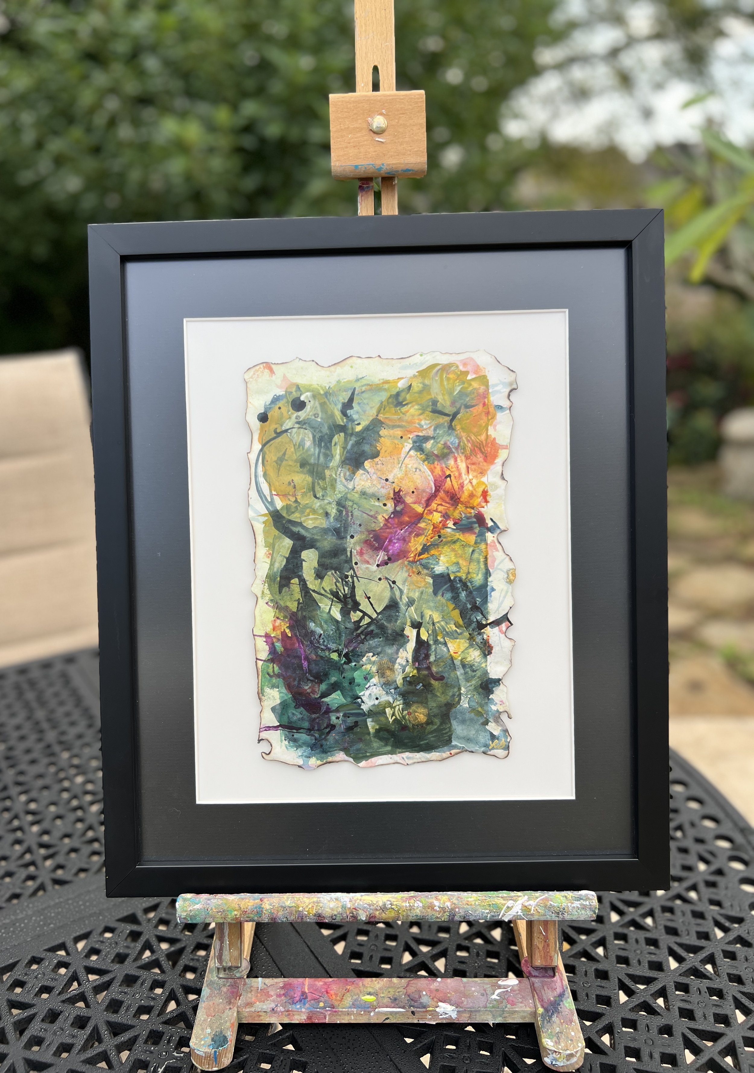 “The Phoenix Rises From The Ashes” is an 8×12 original abstract painting on paper, mounted on mat board and beautifully framed in a black wood frame with non-glare acrylic (final size 16×19). Torn edges, layered color, and bold gestural marks create a raw, expressive composition that embodies transformation and strength. Vibrant yellows, pinks, and deep greens rise through smoky charcoal tones, echoing the rebirth and renewal suggested by the title.